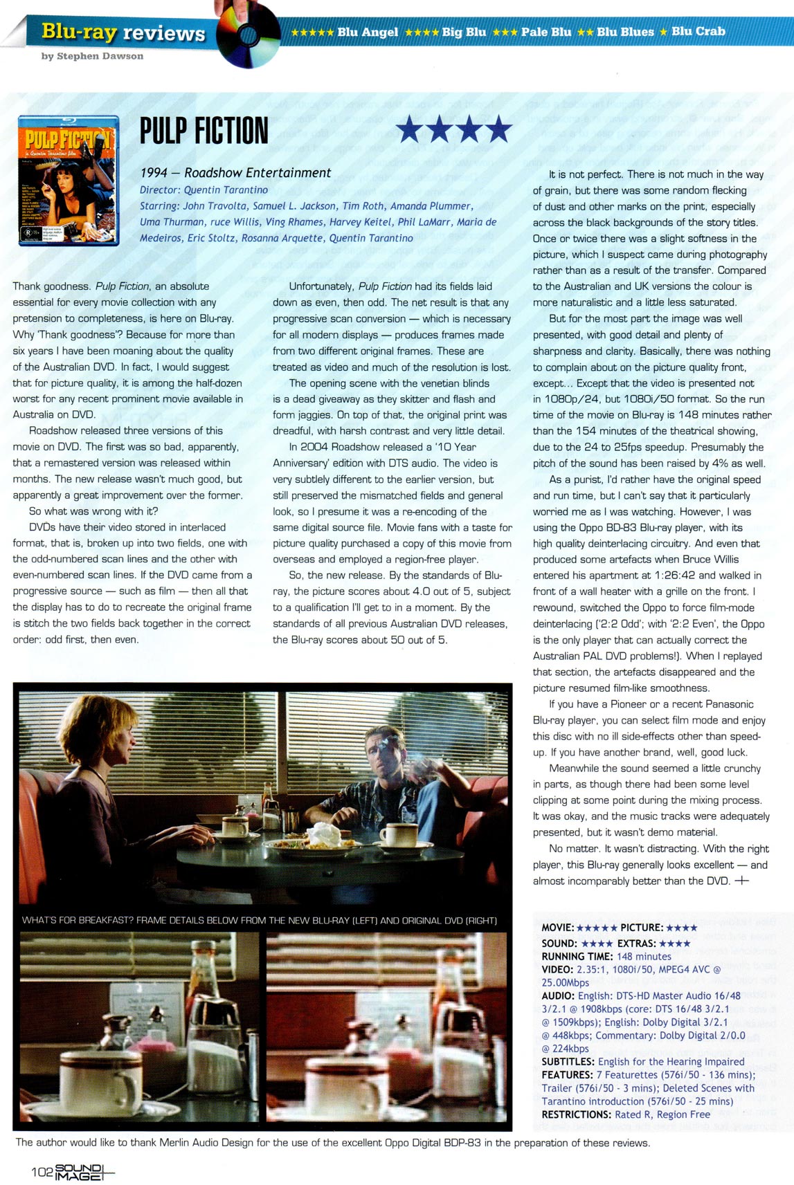 Unfortunately, Pulp Fiction had its fields laid down as even, then odd. The net result is that any progressive scan conversion -- which is necessary for all modern displays -- produces frames made from two different original frames. These are treated as video and much of the resolution is lost.