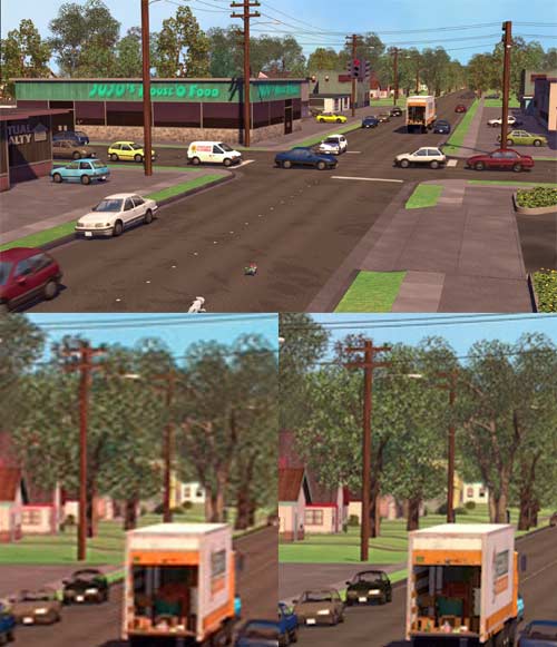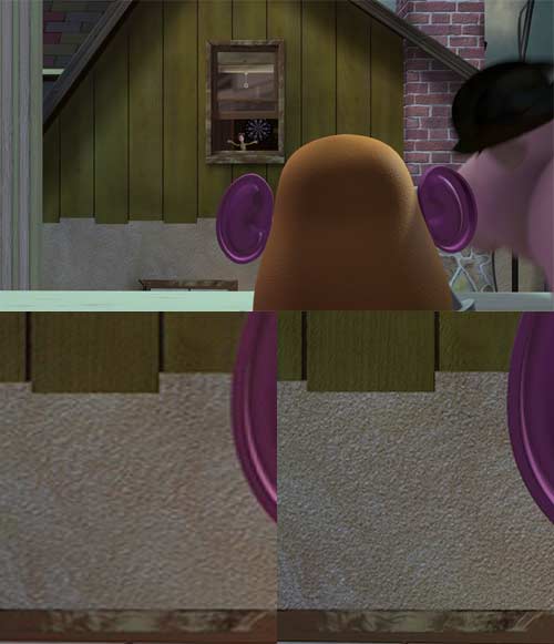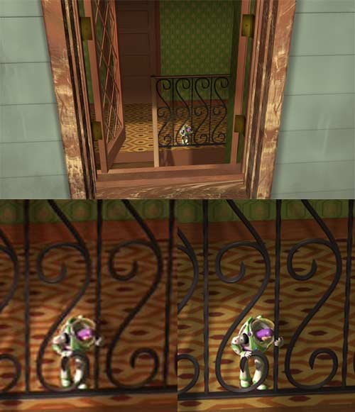 What you get is perfect geometry, a generally quite realistic appearance of contact between elements, and sometimes a startlingly realistic appearance of synthetic objects (buildings, furniture, carpets). What was to come in later Pixar productions, but apparently not ready for Toy Story, were more aggressive indications of distance through focus and atmospheric haze, and modelling of natural objects. Toy Story 2 is more developed in this regard, but perhaps held back a little by the need for a family resemblence to its predecessor.