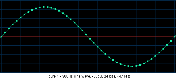 A PCM recording is simply a long list of the values of those boxes. Two important determinants of the accuracy of that recording are how frequently those values are recorded, and the degree of resolution that the numbering system allows. The signal in Figure 1 uses the CD-standard sampling frequency of 44,100 hertz. That means that 44,100 samples are taken each second. The waveform shown is a 980 hertz sine wave. If you count up the number of samples in one full cycle, you will see that there are 45. Divide 44,100 by 45 and you get 980. (I use 980 hertz here rather than 1,000 simply because 1,000 does not divide evenly into 44,100, and when you start manipulating the signal it generates all sorts of spurious noises.)