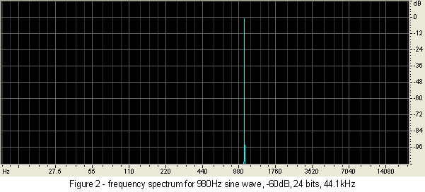 Now let's go back to Figure 1. This 980 hertz sine wave was created to simulate a very quiet sound in a recording. Its peak level is 60 decibels below the maximum recording level (that is: -60dBFS where FS is 'Full Scale'). Despite this it sounds excellent, because I cheated. I created this test signal with a resolution of 24 bits. See Figure 2, which shows the frequency spectrum of this signal. The 0dB mark on the right hand axis is actually displaced to indicate -60dBFS. Yet even at the bottom of the figure (which is at -168dB full scale) there is no noise showing. Ah, digital perfection!
