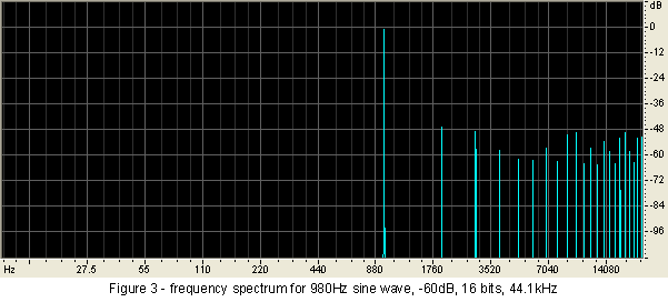 Now let us simulate recording this signal on a 16 bit system. Actually, I will do a digital conversion from 24 bits to 16 bits. Note that this is a 'pure' conversion, with no other processing. All that will happen is that the computer recalculates the height of each sample from a 24 bit number space, down to a 16 bit number space, while retaining the same overall level (that is, -60dBFS for the peaks). Figure 3 shows the frequency spectrum of the result.