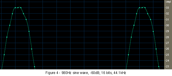 Let us go briefly back to the original 980 hertz tone. This was created with a peak level of -60dB but with 24 bits of resolution. The highest sample value out of the roughly +/-8 million available was 8,389 (there are another 8+ million below zero, adding up to the 16.7 million total). This value is just slightly higher than can be held by a 14 bit number space, so the original signal had an effective resolution of 14 bits. But after conversion to 16 bits, which involves scaling down each sample by a factor of 256, the highest sample value is a mere 33. This is very slightly better than 5 bit sound. Now look at Figure 4, which shows the top portion of the resulting wave. See how the top three samples of the peak are all on the same line? Well, they can't be between the lines because there are no valid values there.