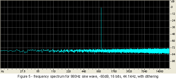 This does not sound very intuitive at all, so let us prove the point. I go back to my original -60dBFS 980 hertz signal with 24 bits of resolution and again reduce it to 16 bits. But this time I add a one bit level of dither during the conversion. The frequency spectrum of the result is shown in Figure 5. Two things immediately stand out. First, there is a significant noise floor at -78dB (-138dBFS). Second, there are no harmonic spikes. These haven't just been masked (look again at Figure 3: they read up to 30dB above where the new noise floor has been placed). They have been eliminated!