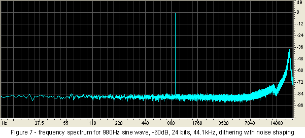 The result is shown in the frequency spectrum shown at Figure 7. Compare this to the non-shaped noise in Figure 5. Instead of the noise hovering around -78dB (ref the -60dBFS signal), it has descended to around -87dB, a 9dB improvement. The tradeoff for this improvement is that it only covers the frequency band up to around 7,000 hertz, whereupon the noise floor starts to rise to a quite poor -42dB (ref the -60dBFS signal) at just under 20,000 hertz.