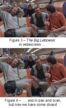 What this means is that quite a few modern movies are, Bug's Life fashion, recomposed from the original for the pan and scan versions. Look at Figures 3 and 4, screen shots from the flipside versions The Big Lebowski. What do you lose in the 'pan and scan' version? Just a little of Steve Buscemi's elbow. But the widescreen version crops out John Goodman's shoes and most of the overhead lights.