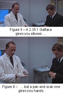 Even the more difficult to handle 2.35:1 aspect movies like Gattaca (actually, it's 2.38:1) can scrub up reasonably well as shown in Figures 5 and 6. Yes, you lose a little of Ethan Hawke's back and some wall space, but you gain hands and more at the bottom of the 4:3 version. Now at least we know what they're looking at.