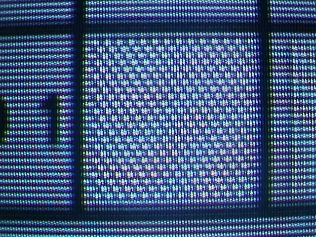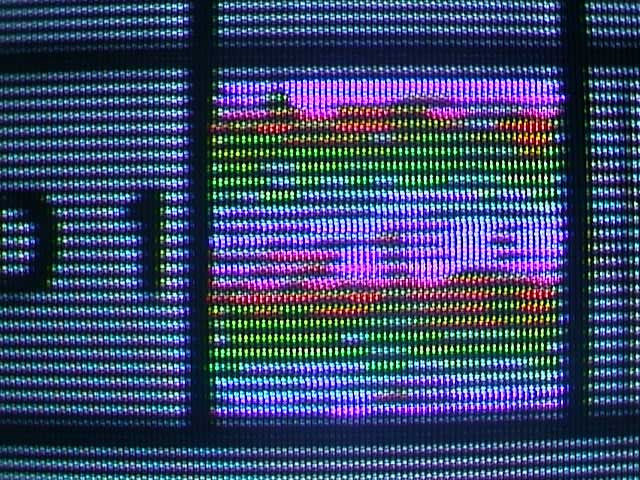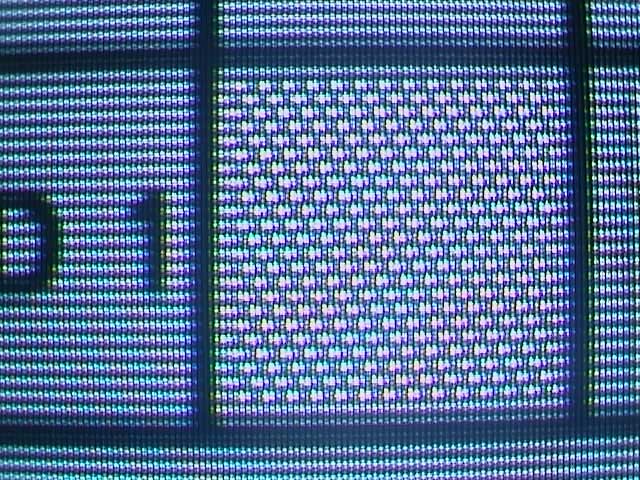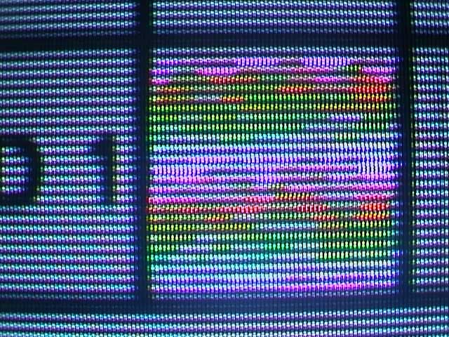 | Diagonal Lines Again those nasty rainbows appear for RF and composite video feeds. Note that this picture is supposed to show fine lines rising diagonally from left to right. This indeed is what it looks like sitting at a normal distance from the TV ... at least with S-Video and component. The differences between the rainbow patterns of the RF and composite shots are because the rainbow was swirling around, even though the DVD picture was paused. | |