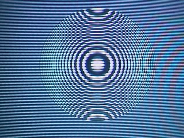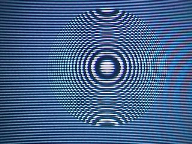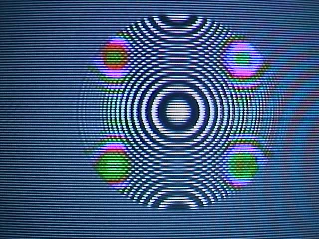 | Concentric Circules This is where the interference between the colour difference and the luminence signal becomes obvious. Note, there is little difference between the RF and composite shots, nor between the S-Video and component shots, but a gulf in the form of rainbowing between the two categories. | |