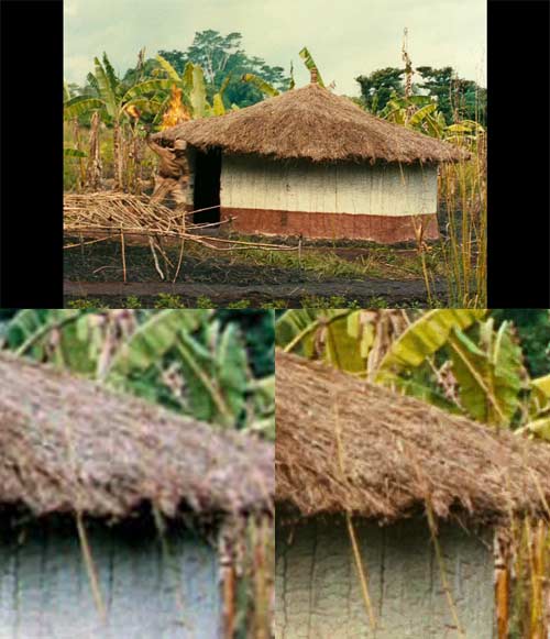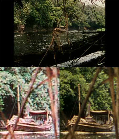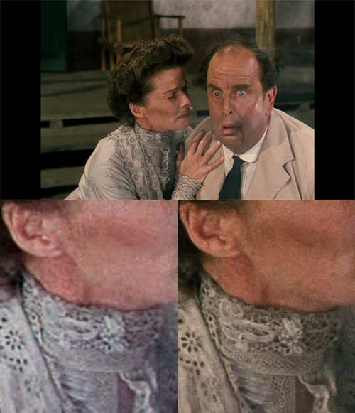 At the top of each is the full frame (suitably shrunk down) used in the comparison, with a 250 pixel wide detail from the frame underneath. The left side is from the PAL DVD. The image was captured digitally from the disc, scaled up from its native 720 by 576 pixel resolution to 768 by 576 (to present in the correct aspect ratio) by the application. I then scaled it, in order for it to be comparable to the Blu-ray version, to 1,440 by 1,080 pixels.