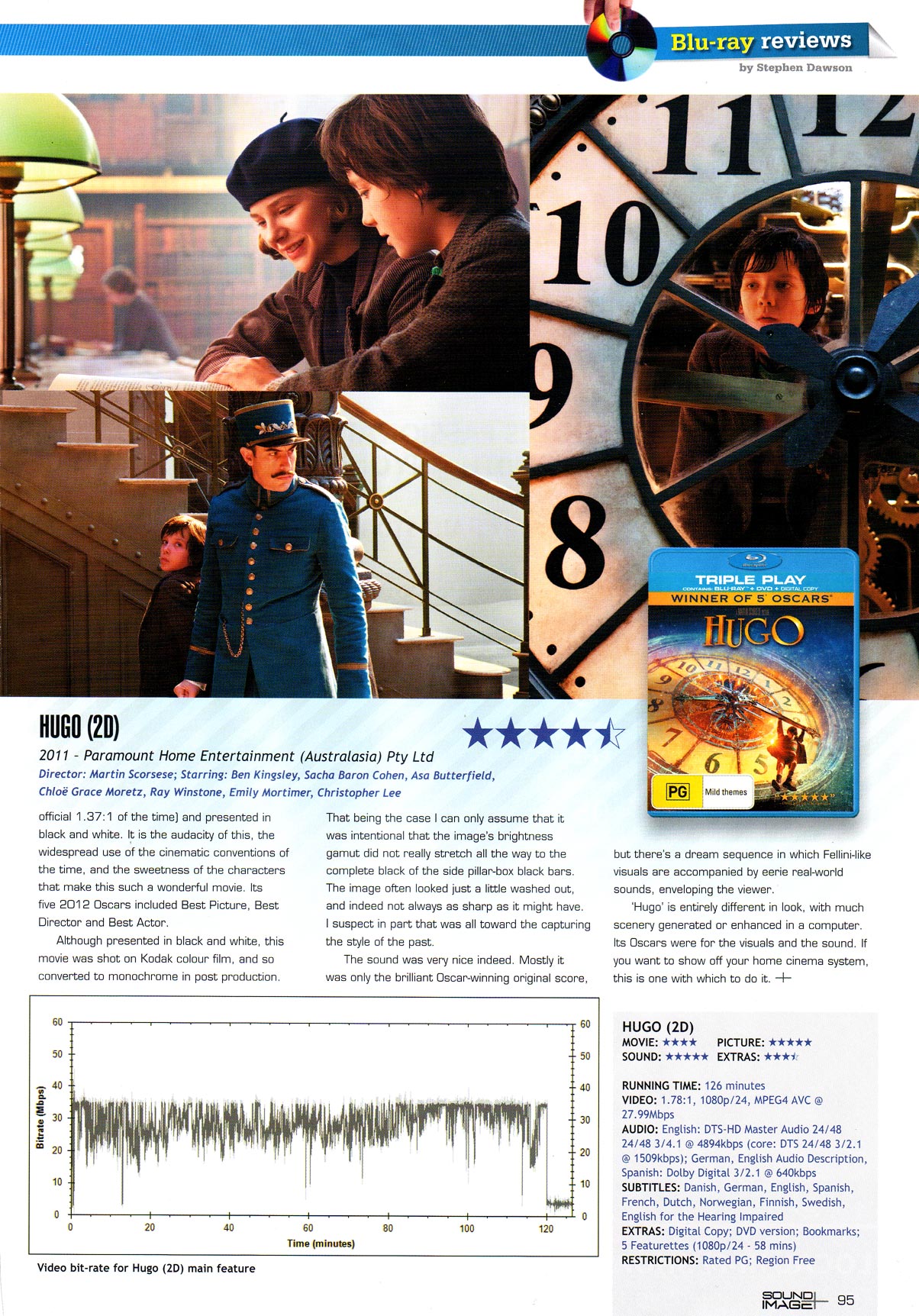 Hugo is entirely different in look, with much scenery generated or enhanced in a computer. Its Oscars were for the visuals and the sound. If you want to show off your home cinema system, this is one with which to do it.