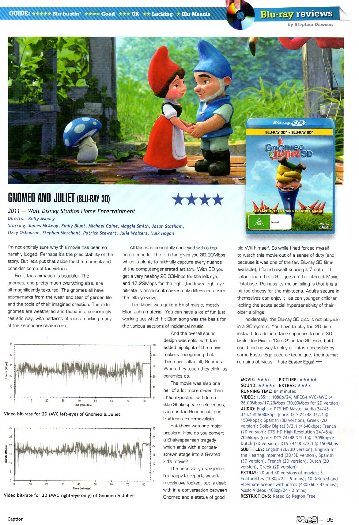 First, the animation is beautiful. The gnomes, and pretty much everything else, are all magnificently textured. The gnomes all have score marks from the wear and tear of garden life, and the tools of their imagined creation. The older gnomes are weathered and faded in a surprisingly realistic way, with patterns of moss marking many of the secondary characters. All this was beautifully conveyed with a top notch encode. The 2D disc gives you 30.00Mbps, which is plenty to faithfully capture every nuance of the computer-generated artistry. With 3D you get a very healthy 26.00Mbps for the left eye, and 17.29Mbps for the right (the lower right-eye bitrate is because it carries only differences from the left eye view).