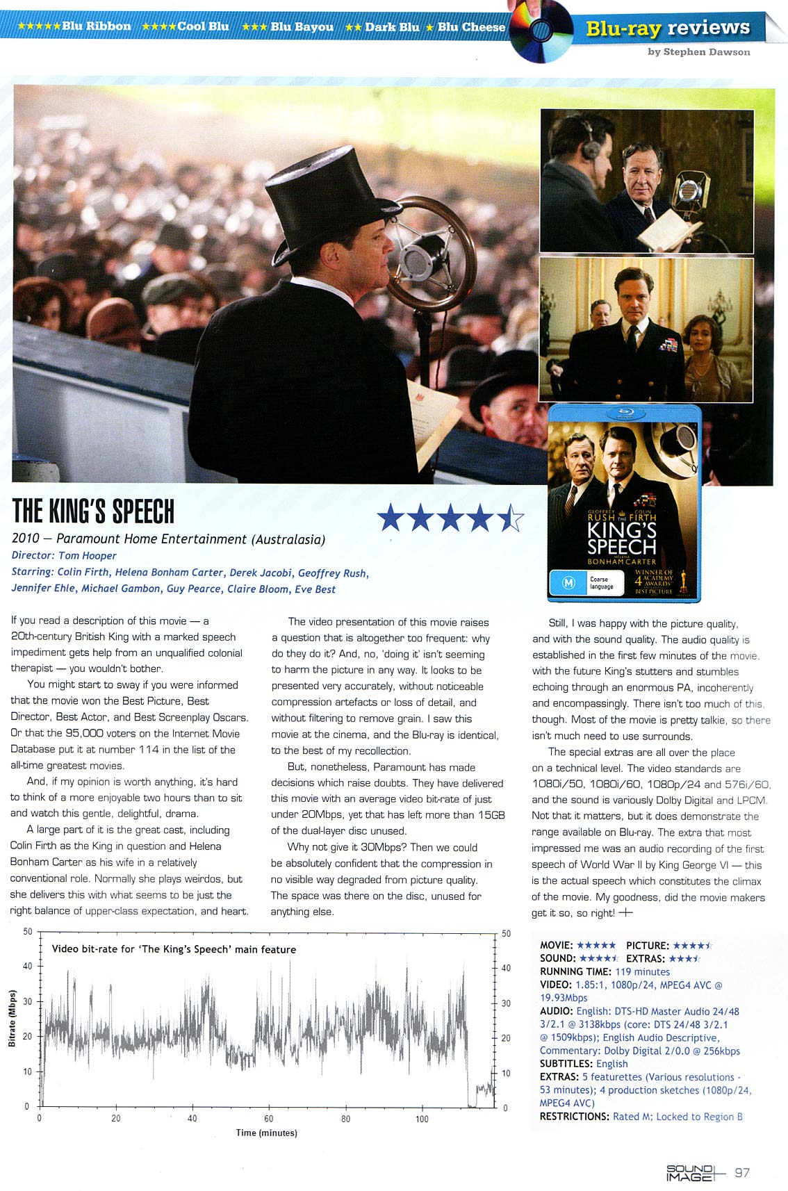 The special extras are all over the place on a technical level. The video standards are 1080i50, 1080i60, 1080p24 and 576i60, and the sound is variously Dolby Digital and LPCM. Not that it matters, but it does demonstrate the range available on Blu-ray. The one that most impressed me was an audio recording of the first speech of World War II by King George VI. This is the actual speech which constitutes the climax of the movie. My goodness, did the movie makers get it so, so right!