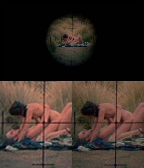 This early 'through a rifle scope' image shows far more detail on the Blu-ray. Look at the tartan of the rug, for example: