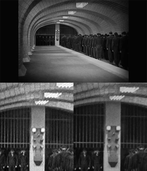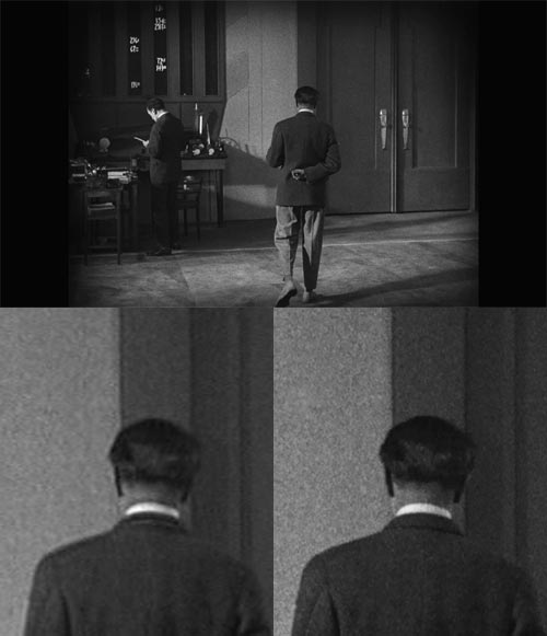 But the restorers have been clever. The additions were not just poorer in quality, they were also more heavily cropped. These frames have been resized so that their content matches the size of the higher quality stuff. The bottom and right edges of the frames are in the same place, but a black bar has been inserted at the top, and the existing one at the left has been widened, to fill in the space. This device has reduced the shock of transition (and there are many, especially in the last quarter of the film) between the two different qualities. Somehow the contrast and noise changes seem less jarring than a positional jump. Most of the movie is presented, pillarboxed, in an aspect of exactly 4:3 (1,440 by 1,080 pixels). Oddly, the cropping of the movie differs from the previous DVD release, with more of the picture edges visible sometimes on the DVD version, and sometimes on the Blu-ray.