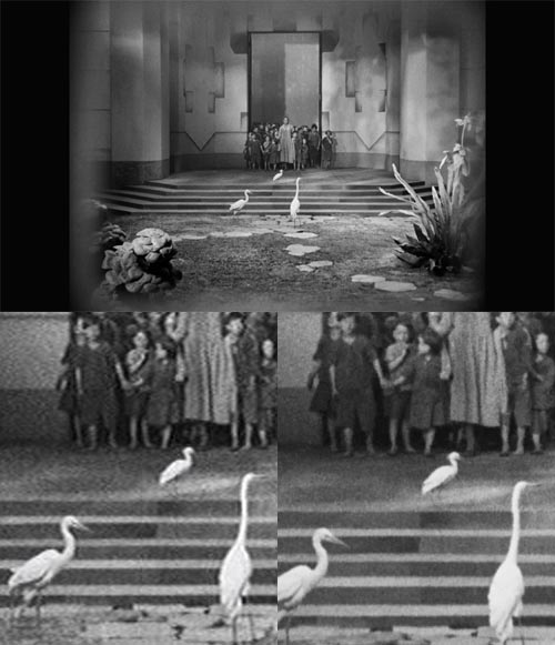 The DVD referenced below was a beautiful restoration drawn from the best available footage. Unfortunately, about 25% of the footage was, at the time it was made (early 2000s) thought to be completely lost. In 2008 a 16mm version of what is thought to be pretty much the whole film was found in Argentina. In the earlier DVD, the missing bits had been described in text plates. Now they could be reinserted. But the 16mm content was a transfer, made in the early 1970s, of a highly degraded nitrate version of the film, so despite their best attempts at restoration, the quality differences are huge. What follows are two frames showing much the same content which were one second apart on this Blu-ray. The first is part of the new reconstruction, taken from the 16mm treasure. The second is the matching part restored from better quality source film. Surprisingly, the transition from one to the other is far less jarring than you might think.