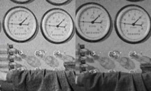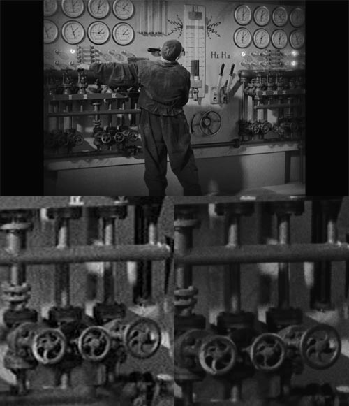 The valves shown above seem smoother and more realistic in the Blu-ray. But I also wanted to look at the dials in the top half of the frame. As we can see, in the Blu-ray the text on their faces is almost readable, and far less so for the DVD version: