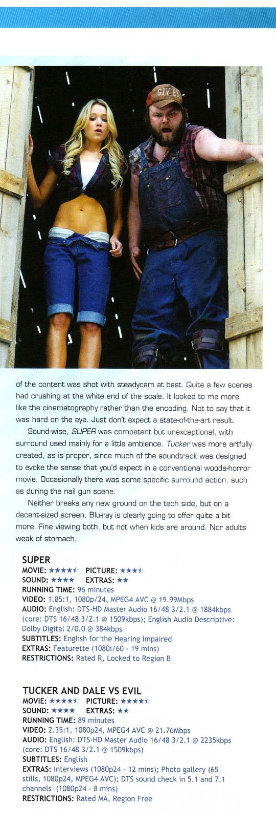 Sound-wise, SUPER was competent, but unexceptional, with surround used mainly for a little ambience. Tucker was more artfully created, as is proper, since much of the soundtrack was designed to evoke the sense that you'd expect in a conventional woods-horror movie. Occasionally there was some specific surround action, such as during the nail gun scene.